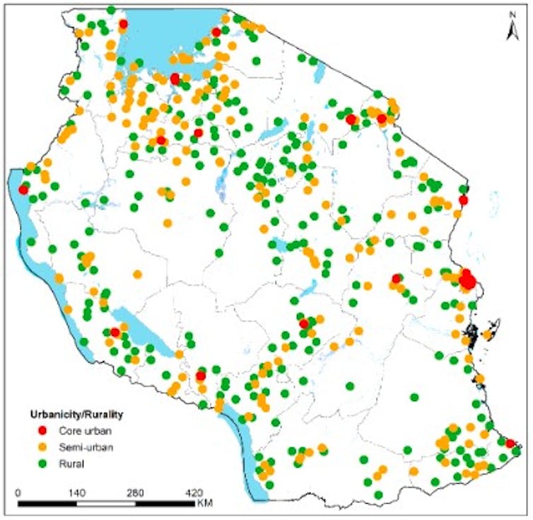 Figure 1: Each dot on this map represents a group of households surveyed during the 2016 Tanzania Demographic and Health Survey (DHS) and the three categories of urbanicity derived from satellite imagery.
