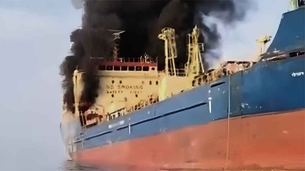 An oil tanker that ignored the closure of the strait of Hormuz appears to be on fire on 1 March.