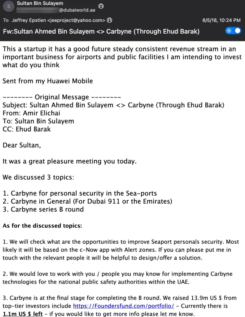 The two countries’ relationship continued to thrive, and on August 5, 2018, Sulayem emailed Epstein showing interest in Carbyne, an Israeli cybersecurity firm funded by Epstein and chaired by Barak, that enabled emergency dispatchers and security agencies to access precise location data and live audio and video feeds from mobile phones.