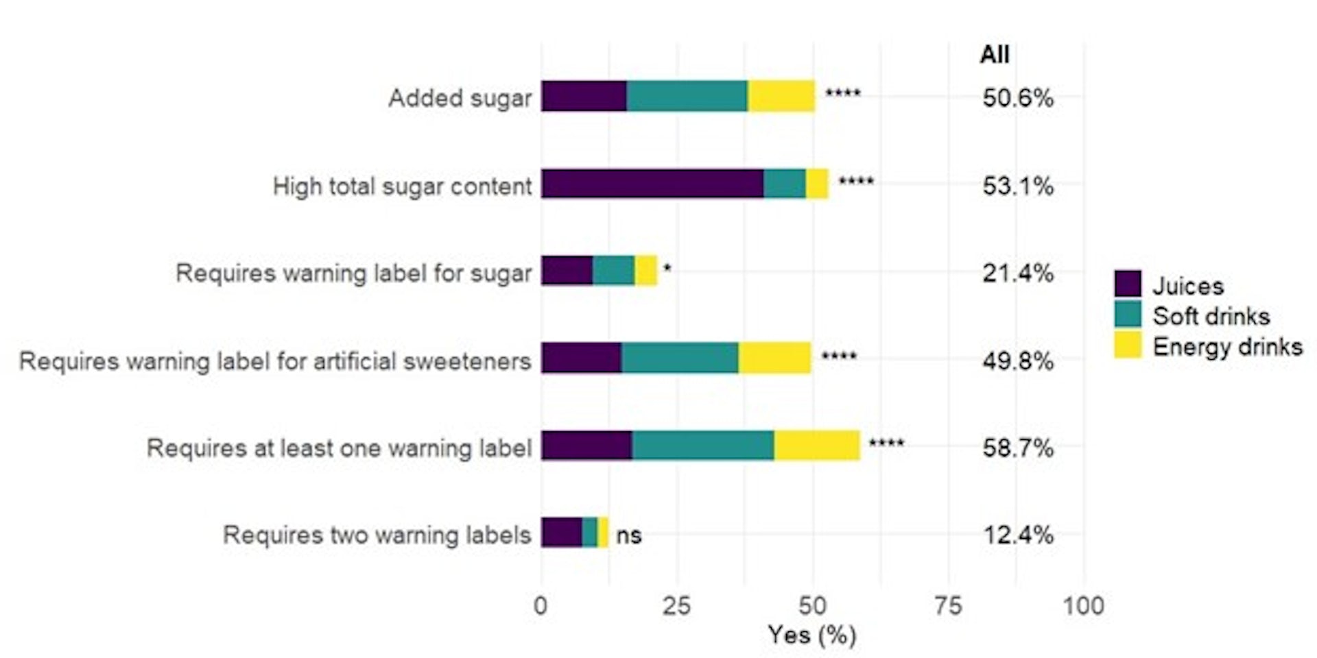 Juices were least likely to qualify for warning labels. Only 30% of juices met the criteria , versus 94.1% of soft drinks and 96.9% of energy drinks. Excluding 100% fruit juices from South Africa’s proposed warning label regulations could have serious public health consequences.