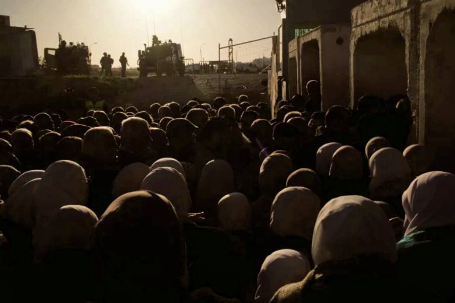 Palestinian worshippers line up to pass through the Israeli military’s Qalandiya checkpoint between the occupied West Bank city of Ramallah and occupied East Jerusalem on their way to attend Friday prayers, at the Al-Aqsa Mosque compound, during the Muslim holy month of Ramadan, on Friday, February 20, 2026 [Leo Correa/AP]