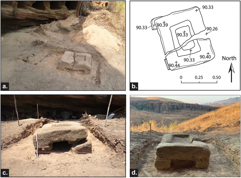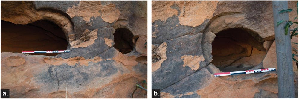 Excavations at this rock shelter revealed more archaeological structures, including carved sandstone walls and a large stone basin.