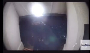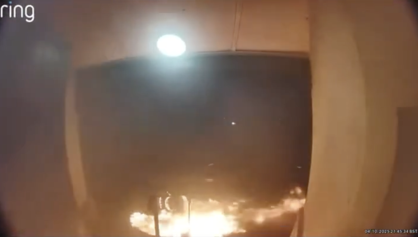 CCTV security camera footage of the mosque showing the flames engulfing the entrance.