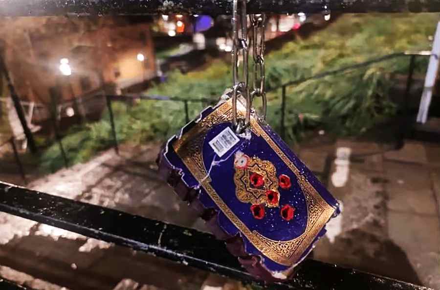 In a statement, the mosque’s administration said a copy of the Holy Quran, with six bullet holes, was found chained to the railings of the stairs.
