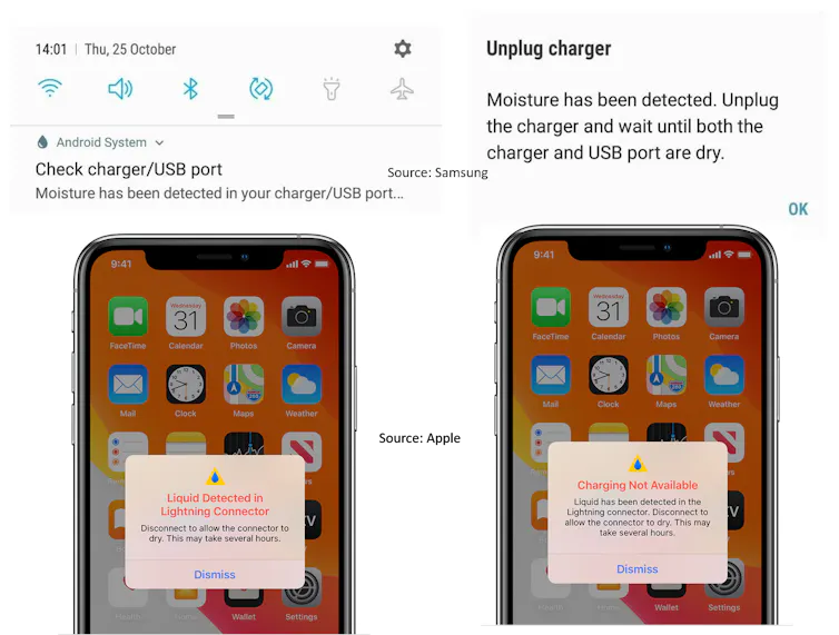 If you have any of the more recent smartphones from Apple or Samsung, then your device will be able to detect liquid or moisture in its charging port and will warn you with an alert. This notification only goes away once the port is dry.