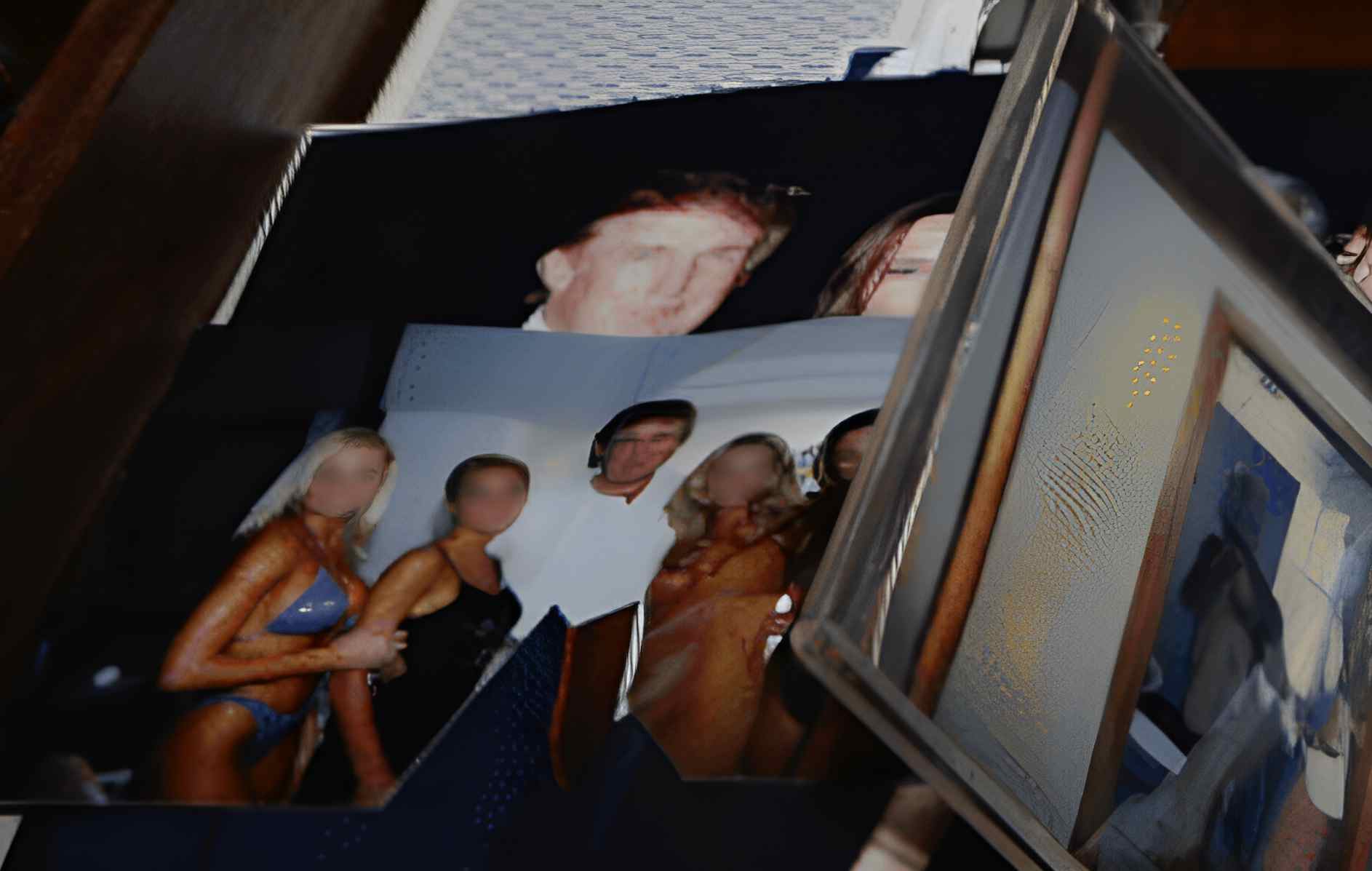 One picture has Trump standing surrounded by women in bathing suits, while the second appears to be an already known picture – partly obscured – of him, his wife Melania, Ghislaine Maxwell and Jeffrey Epstein.