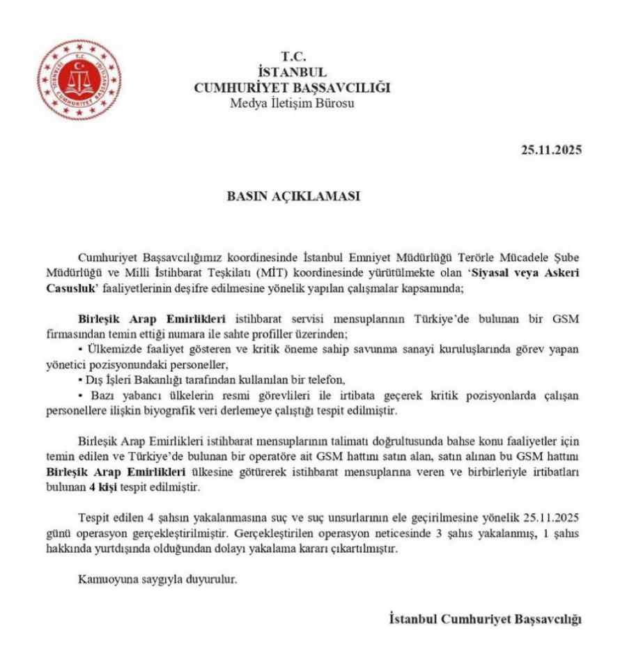 The original statement released by Turkish authorities on 25/11/2525 referencing the UAE (Birlesik Arap Emirlikleri)
