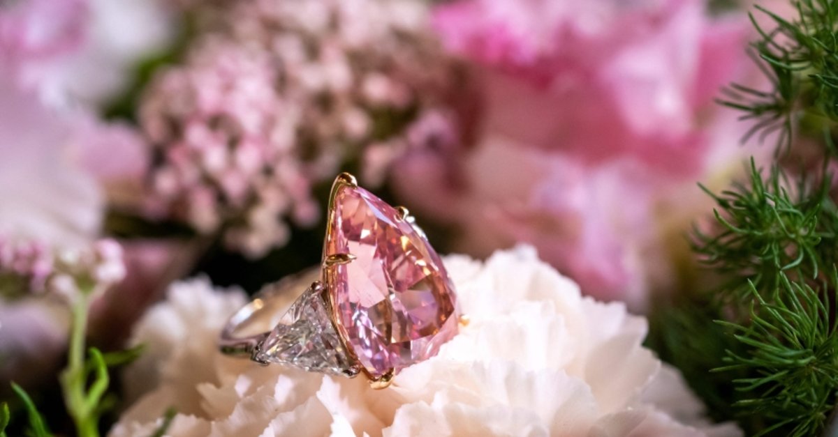The brilliant pink stone, which is shaped like a teardrop and is set on a ring with two sizable white diamonds on either side, weighs exactly 18.18 carats.