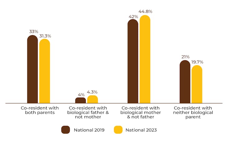 However, fewer children live with their biological fathers than with other men. The percentage of children who live with their biological fathers has dropped from 45.3% in 1996 to 35% in 2023.