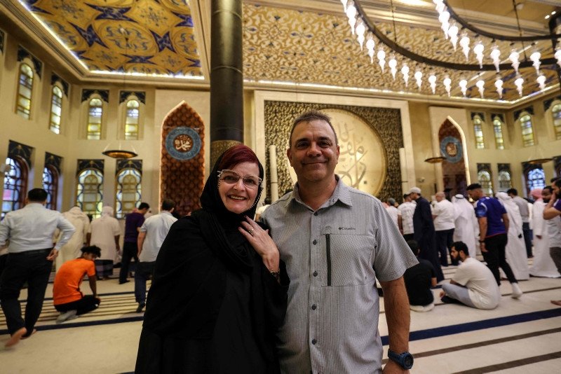 Canadian couple Dorinel and Clara Popa listened to the call to prayer at an Ottoman-style mosque in Doha’s Katara cultural district.
